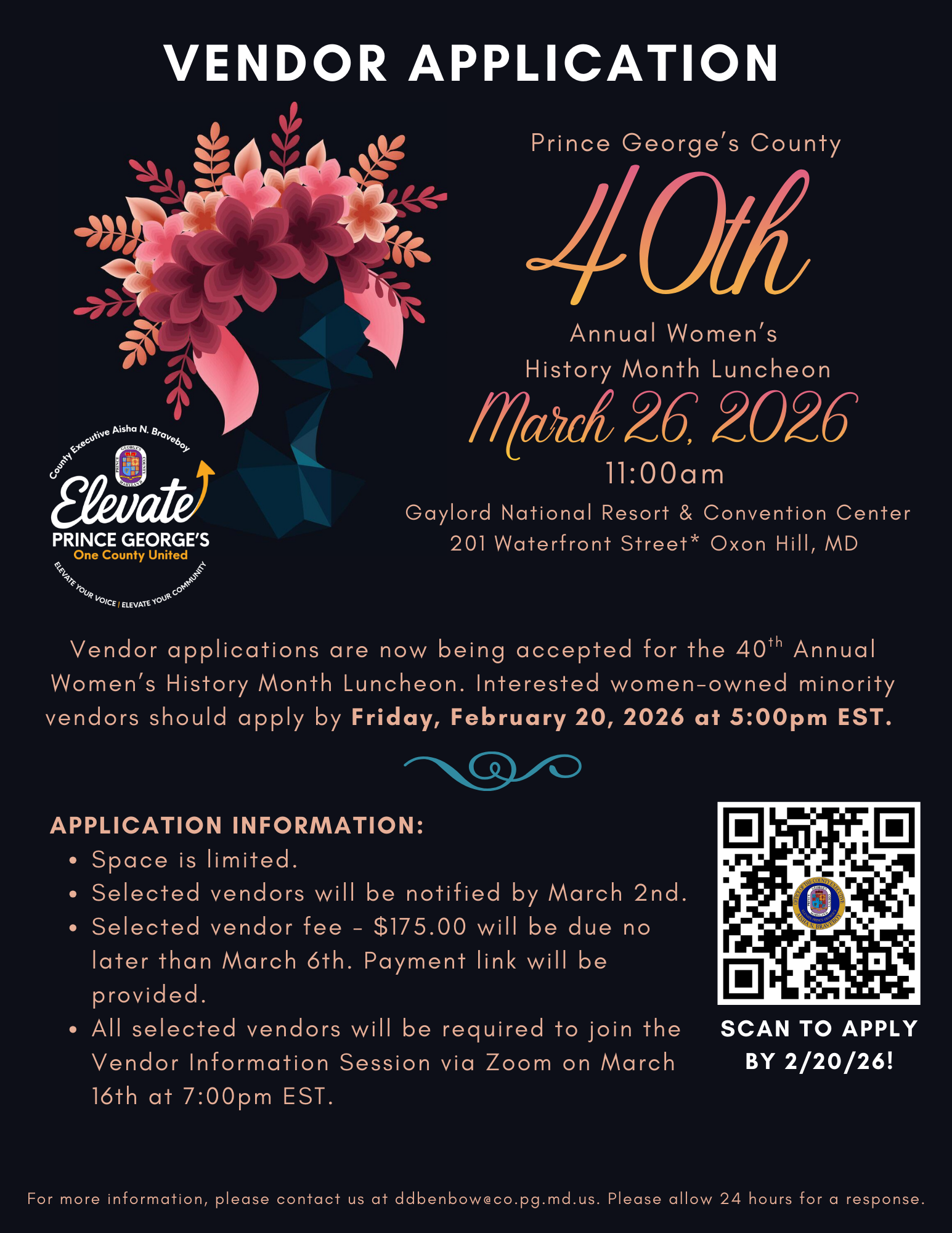 On behalf of County Executive Aisha N. Braveboy, we are proud to invite women-owned and minority businesses to participate as vendors in the 40th Women’s History Month Luncheon, celebrating four decades of women’s leadership and diversity in Prince George’s County.